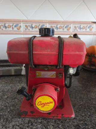 Se vende motobomba antigua de la marca Campeón. Es una pieza única, ideal para coleccionistas o entusiastas de maquinaria clásica. - Marca: Campeón - Diseño robusto y bien conservado - Incluye depósito de combustible - Dispone de ruedas para facilitar su transporte