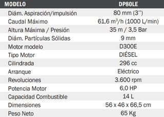 Motobomba de agua DP80LE, con motor diésel de 4 tiempos y una potencia de 6 cv, con u diámetro de 80 mm para Aguas Limpias para un caudal de 61,6 m3/h y una altura máxima de 36 m. con arranque eléctrico. Enviamos a toda españa, IVA incluido y transporte gratuito