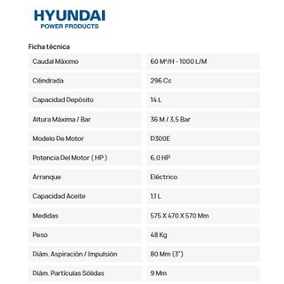 Motobomba de agua Hyundai DHY100LE arranque eléctrico, con motor diésel de 4 tiempos y una potencia de 10 cv, cilindrada de 412 cc, depósito de combustible 14 litros y un caudal máximo de 96.000 litros por hora. Enviamos a toda españa, IVA incluido y transporte gratuito