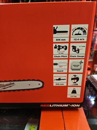 MOTOSIERRA MILWAUKEE DE 40 CMS DE BARRA VELOCIDAD DE CADENA 12 4 METROSNPOR SEGUNDO GATILLO DE VELOCIDAD VARIABLE SE SUMINISTRA CON 80CC DE ACEITE DE CADENA Y FUNDA DE PLASTICO MOD OFERTADO VERSION 0 SOLO MAQUINA Y LLEVATE DE REGALO UNA BATERIA HIGH OUTPUT DE 5,5 AH HACEMOS ENVIOS Y LOTES MAS ARTICULOS EN MI PERFIL PRECIOS NO NEGOCIABLES SOMOS DISTRIBUIDORES HACEMOS DEMOSTRACIÓNES DE PRODUCTOS DE JARDÍN PONTE EN CONTACTO