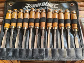 Set de 12 gubias para tallar madera, ideal para trabajos de artesanía y carpintería. - Mango de madera. - Cuchillas de acero. - Incluye estuche.