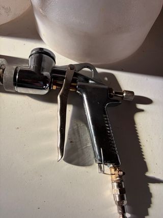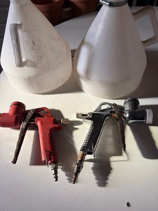 Se venden dos pistolas de aire, una roja y otra plateada, junto con dos recipientes blancos. precio las dos juntas 250 - Pistola roja con gatillo y boquilla. - Pistola plateada con gatillo y boquilla. - Dos recipientes blancos con asas.