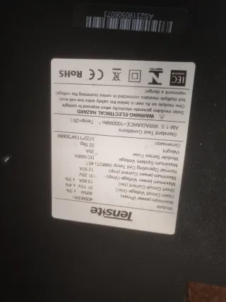 Panel solar de la marca Tensite, modelo 405M(BK). - Potencia máxima (Pmax): 405W ±3% - Voltaje de circuito abierto (Voc): 37.15V ±4% - Corriente de cortocircuito (Isc): 13.85A ±5% - Voltaje de potencia máxima (Vmp): 31.25V - Corriente de potencia máxima (Imp): 12.97A - Temperatura de operación normal de la celda (NMOT): 45°C - Voltaje máximo del sistema: DC1500V - Fusible de la serie del módulo: 25A - Peso: 22.5kg - Dimensiones: 1722*1134*30MM - Condiciones estándar de prueba: AM:1.5 IRRADIANCE=1000W/m², Temp=25°C - Advertencia: Peligro eléctrico. Los módulos solares generan electricidad al exponerse a la luz solar. Un solo módulo