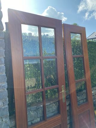 Preciosa pareja de puertas de madera maciza con seis paneles de cristal. Son de madera oscura y tienen un acabado pulido. Ideales para dar un toque clásico y elegante a tu hogar. - Puertas de madera de alta calidad. - Color madera oscura. - Acabado pulido.