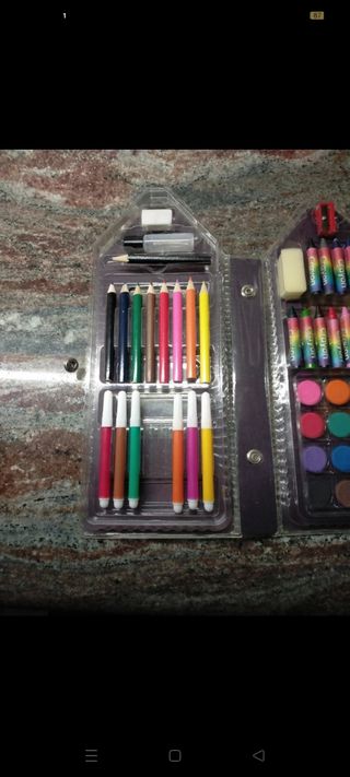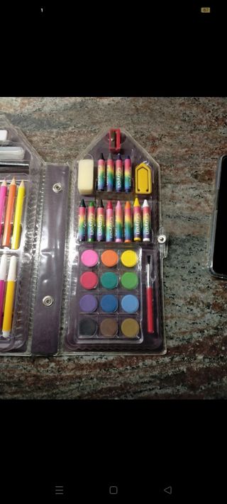 Set de arte completo para niños, ideal para explorar la creatividad. - Incluye lápices de colores. - Rotuladores (aunque dos de ellos no están, porque no funcionaban). - Acuarelas. - Lápiz de grafito. - Goma de borrar. - Sacapuntas.