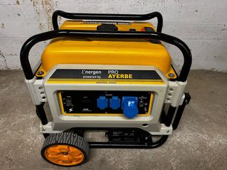 Generador Ayerbe de 3,8Kw con motor Suzuki V160. Con ruedas para facilitar transporte. Se le ha cambiado el aceite y revisado recientemente. - Color amarillo y negro. - Estructura metálica. - Filtro de combustible visible.