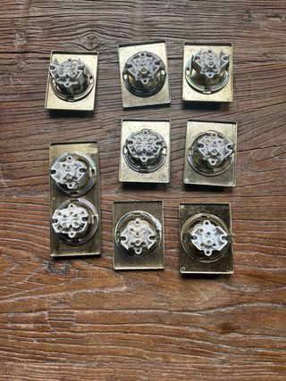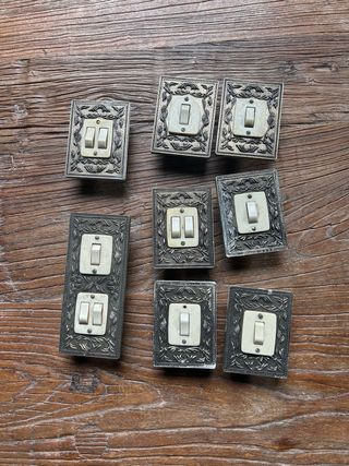 Conjunto de ocho interruptores de luz con un diseño Art Decó. precio de el lote. se vende así. - Marcos ornamentados con detalles. - Cubiertas de interruptor en color marfil. - Incluye un interruptor doble.60