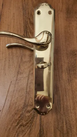 Juego de manillas para puertas con un acabado dorado brillante. El diseño es clásico y elegante, aportando un toque distintivo a cualquier puerta. - Material: Latón pulido. - Diseño: Rectangular con manilla curva. - Montaje: Dos tornillos de fijación.