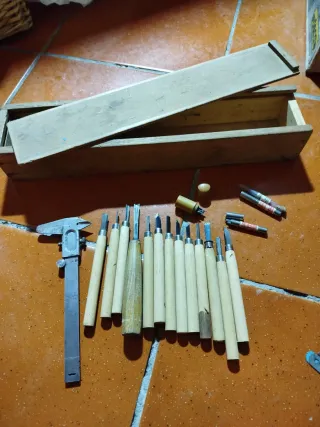 Set de 12 gubias para tallar madera. Incluye un calibre. - 12 gubias de diferentes formas y tamaños. - Calibre de metal incluido. - estuche de madera - juegos de minas para portaminas. Precio negociable