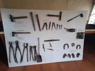 Panel expositor con diversas herramientas de herrero antiguas. Ideal para coleccionistas o decoración. - Martillos de diferentes tamaños. - Alicates y tenazas. - Clavos y punzones. - Herraduras. - Lámpara de aceite y soplete.