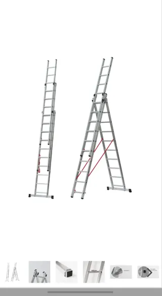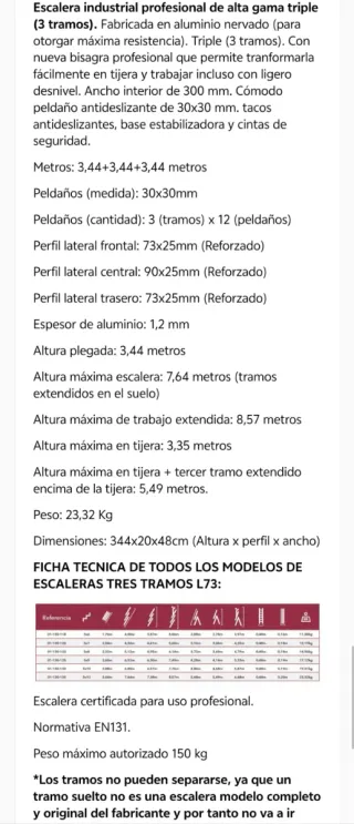 Escalera de aluminio versátil y resistente, ideal para múltiples usos. - Fabricada en aluminio. - Configuración 3x12 peldaños. La hemos usado 1 día, literalmente! Pero es que calculamos mal el tamaño y no nos entra para usarla en casa 😞 Fabricada en aluminio nervado (para otorgar máxima resistencia). Triple (3 tramos). Con nueva bisagra profesional que permite tranformarla fácilmente en tijera y trabajar incluso con ligero desnivel. Ancho interior de 300 mm. Cómodo peldaño antideslizante de 30x30 mm. tacos antideslizantes, base estabilizadora y cintas de seguridad. Metros: 3,44+3,44+3,44 metros