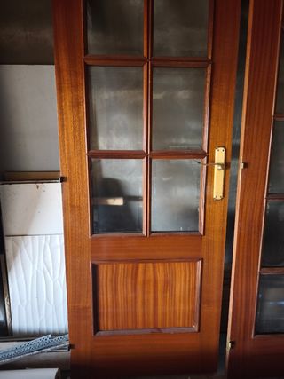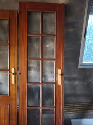 Conjunto de dos puertas de madera con diseño de cristal. - Acabado en madera oscura.. - Tiradores dorados. - Paneles de cristal. 204 cm x 63 cm cada puerta Como nuevas, super bien conservadas!!!