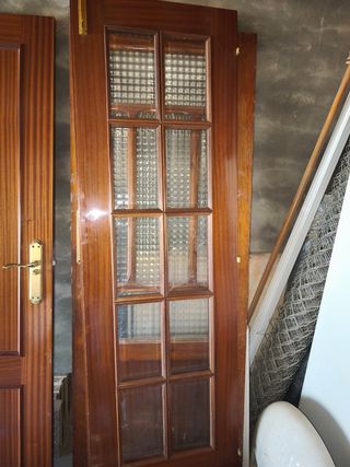 Puerta de madera con diseño clásico y detalles en cristal. - Marco de madera. - Paneles de cristal. - Tirador metálico dorado. 72 cm x 191 cm Perfectas condiciones y material muy bueno!!! En verla, alucinaras de lo vien que está