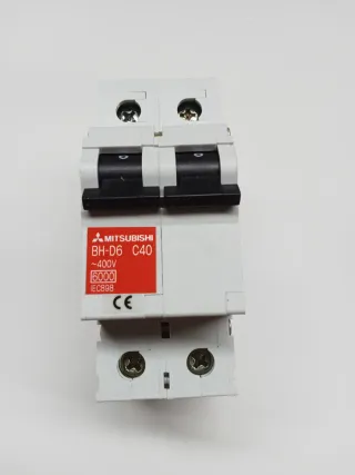 Interruptor magnetotérmico de la marca Mitsubishi, modelo BH-D6 C40. - Dos polos (2P). - Intensidad nominal de 40A. - Tensión nominal de 400V. - Poder de corte de 6000A. - Certificación CE.