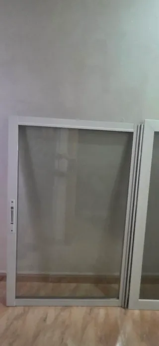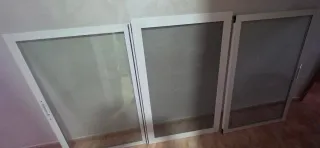 Conjunto de tres ventanas con marcos de aluminio y cristal. - Marcos de aluminio blanco.Y mosquitera - Cristal transparente. -Medidas:ancho 72cm y alto 110cm. Hay 4 ventanas y 2 mosquiteras.