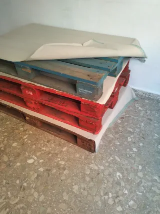 Conjunto de palets de madera, ideales para diversos usos. - Palets de madera resistentes. - Colores: rojo, azul y madera natural. Tengo 21 pale