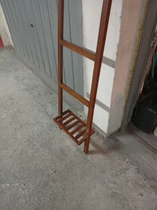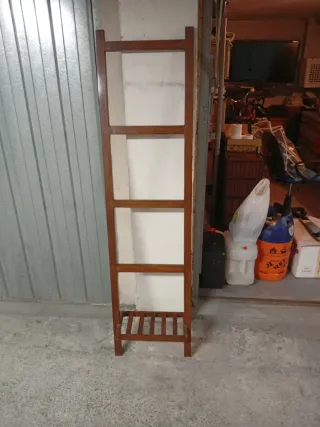 Estantería de madera con diseño de escalera, ideal para decoración. - Estructura de madera oscura. - Cuatro niveles. - Base con listones.