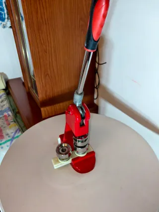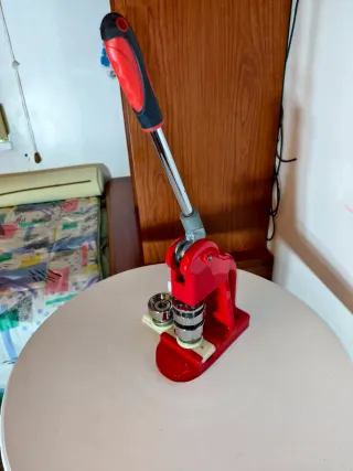 Prensa manual para la creación de botones personalizados. Ideal para manualidades y pequeños proyectos. - Color rojo y negro. - Mango ergonómico.