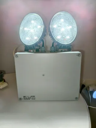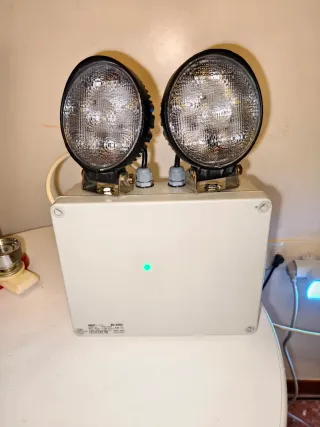 Foco de emergencia con dos luces LED. La caja es de color blanco y tiene un indicador verde. - Dos focos LED. - Caja blanca. - Indicador LED verde.carga batería