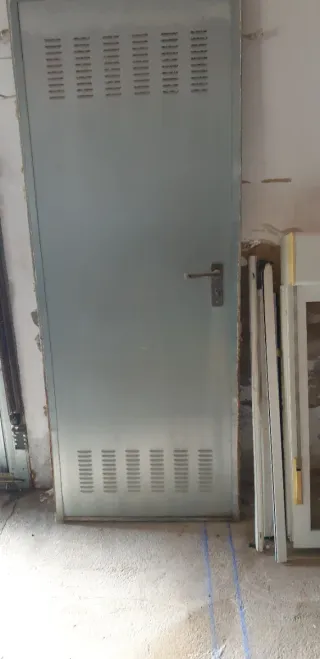 Puerta metálica gris, ideal para patios o trasteros. Cuenta con un diseño funcional y resistente. medidas 79 cm de ancho por 2 metros de altura no se hacen envíos - Paneles superiores e inferiores con rejillas de ventilación. - Tirador metálico. - Acabado en color gris.