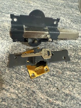 Cerradura de seguridad de la marca Traba. Incluye la llave. - Mecanismo de cierre robusto. - Placa frontal dorada con el logo de Traba.