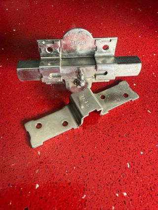 Cerrojo de seguridad de la marca Traba. Fabricado en metal plateado y dorado. - Mecanismo de cierre. - Placa de montaje dorada. - Incluye llave.