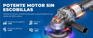 Amoladora angular inalámbrica, con un avanzado motor sin escobillas, ofrece una velocidad en vacío de hasta 9000 rpm y un diámetro de disco de 125 mm. Ofrece el mismo rendimiento que una amoladora angular con cable comparable de 1000 W y realiza sin esfuerzo trabajos de corte y amolado de metal y piedra de dificultad media a alta. INCUYE: 1 x Amoladora angular sin escobillas 18V, 1 x Mango anti-vibración, 2 x Protecciones de bloqueo rápido, 2 x Disco de corte 125mm, 2 x Disco de desbaste 125mm, 2 x Disco de láminas 125mm, 1 x Batería de ion-litio 4.0 Ah, 1 x Cargador 2A, 1 x Maletín de transporte, 1 x Llave, 1 x instrucciones.