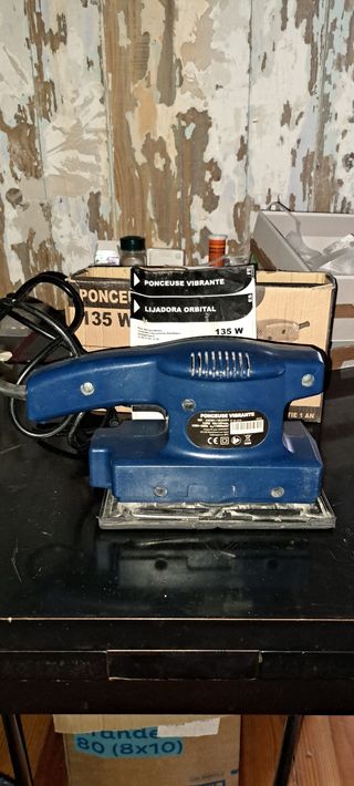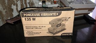 Lijadora vibrante Ponceuse de 135W. - Dimensiones del plato: 187 x 90 mm. - Velocidad a vacío: 11000 tr/min. - Incluye 1 hoja abrasiva (grano 80). - Incluye 1 adaptador de extracción de polvos.
