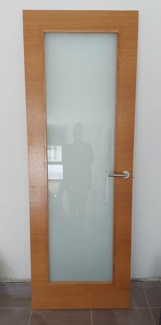 Puerta de madera maciza con un panel de cristal. Es de izquierdas. Medidas 172cm de alto x 62cm de ancho x 3cm de ancho. Un saludo.