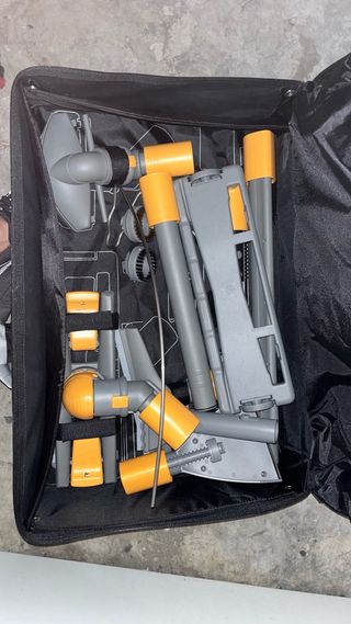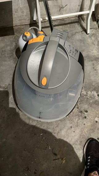 Aspiradora industrial en color gris y negro, con manguera flexible. Aspira líquidos, desinfecta y aromatiza zonas. - Incluye bolsa de transporte. - Diseño compacto.