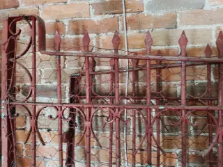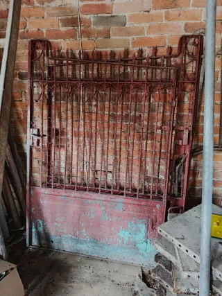 Cancilla antigua de hierro macizo, con un diseño ornamental y detalles decorativos. Cada hoja mide 120cm de largo por 90cm de alto en la parte mas baja y 120cm la parte mas alta