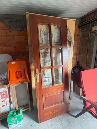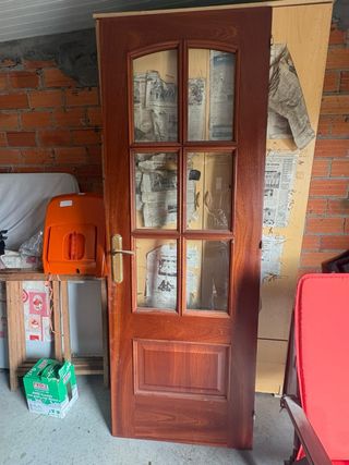 Puerta clásica de madera xatoba, con diseño de seis cristales y un panel inferior. - Material: Madera xatoba. - Diseño: Seis paneles de cristal y un panel inferior. - Estado: Buen estado.