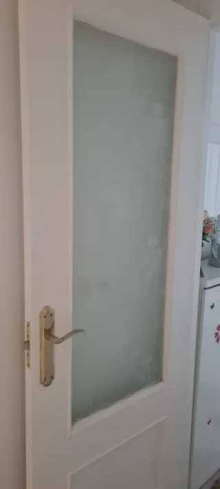 Puerta interior de madera lacada en blanco, con un panel de cristal esmerilado. - Diseño clásico y elegante. - Tirador metálico dorado.