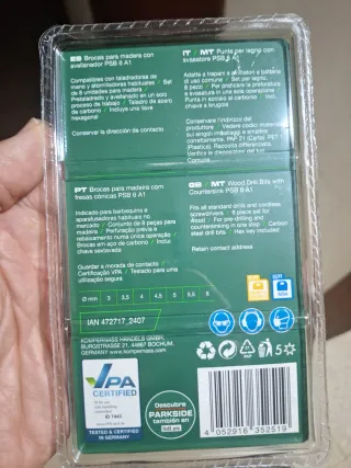 Set de brocas multifuncionales Parkside. - Incluye 4 brocas de diferentes tamaños. - Diseñadas para metal y madera. - Tamaños: 0-20 mm, 4-12 mm, 12.4 mm, 6 mm.
