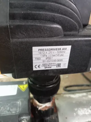 Grupo de presión ESPA modelo PDS05 3-75 con protección IPX5. - Caudal: 20-66 l/min. - Altura máxima: 44m. - Tensión: 230V 1~50Hz. - Intensidad: 3.6A. - Potencia: 0.8kW. - Condensador: 12µF-450V. - Fabricado en España.