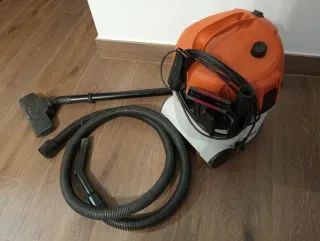 Aspirador Stihl SE 61 en color naranja y blanco. - Incluye manguera y accesorios. - Asa para transporte.