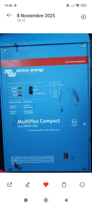ESTA USADO, FUNCIONA CORRECTAMENTE. NO SE ENVÍA SOLO ENTREGA EN MANO EN NUESTROS ALMACENES DE OCAÑA TOLEDO BAJO CITA PREVIA . Inversor multifunción Axpert Vp 1kva de 12v 1000w nominales onda pura,picos de 2000w. regulador de carga solar pwm 50ah 55vdc. Cargador de baterías 20ah, para generadores o red electrica. ideal auto caravanas función de ecualización de baterías. disponemos de mas modelos de inversores Axpert Voltronic ingeteam kostal solax masterpower victron fronius goodwe etc placas solares usadas y nuevas, baterias Agm 2v 6v 12v litio reguladores de carga pwm y mppt kits solares a medida de aislada autoconsumo