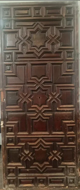 Puerta de madera con diseño estilo mudéjar, trabajada a doble cara. TOLEDANA. ???? Está en Toledo - Motivos geométricos tallados. - Acabado en madera oscura.
