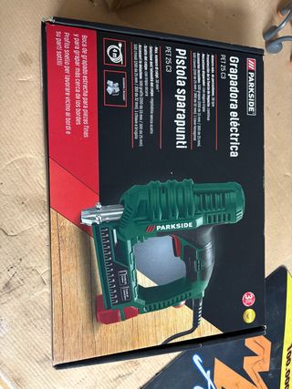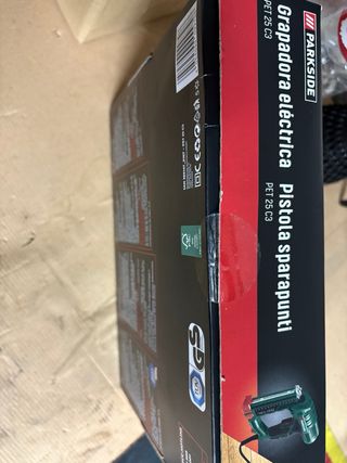 Grapadora eléctrica Parkside PET 25 C3. - Número máx. de percusiones: 30 ipm. - Presetección de la fuerza de impacto continua. - Mecanismo disparador con seguro triple. - Incluye 500 grapas (200 de 15 mm / 300 de 25 mm). - Incluye 500 clavos (200 de 25 mm / 300 de 32 mm). - Incluye 1 llave hexagonal. - Boca de grapado estrecha para piezas finas y para grapar cerca de los bordes. - Perfil delgado para trabajar cerca de los bordes y en partes delgadas.