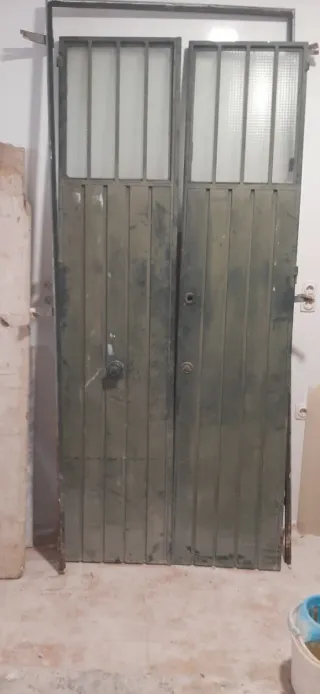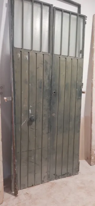 Puerta metálica de doble hoja con sección superior acristalada. - Material: Metal. - Diseño: Doble hoja. - Sección superior con cristales. Medidas totales con marco: Ancho 108cmAlto 240 la cristaleras armada es d 60cm Está muy bien forrada d fibra vidrio interior, aislamiento térmico con llave, En perfectas condiciones ,está sucia d la obra