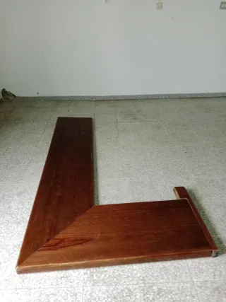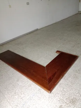 Pieza de madera con forma de L, ideal para barras de bar o mostradores. - Material: Madera. - Color: Marrón oscuro. - Diseño angular.