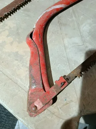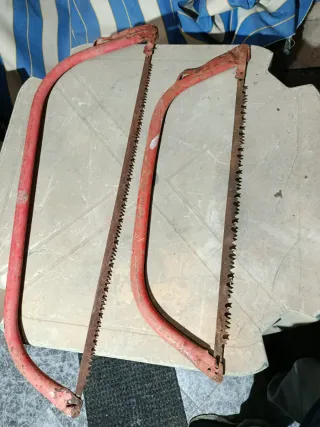 Se venden dos sierras de arco antiguas, ideales para coleccionistas o para trabajos de carpintería. - Estructura de metal rojo. - Hojas de sierra dentadas.