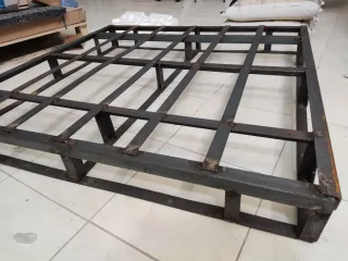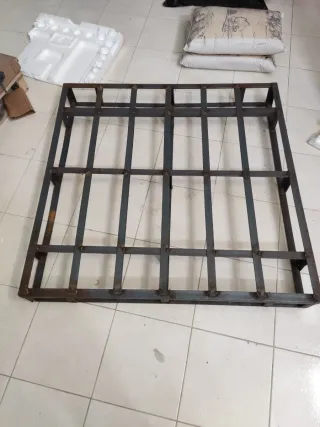 Palet industrial fabricado en hierro, ideal para almacenes o transporte pesado. - Construcción robusta de metal. - 107x107 cm - Hecho por herrero con ángulos y pletinas. - Aguanta muchos kilos - Hierro en buen estado, sin óxidos - No envío