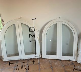 Conjunto de ventanas y puertas arqueadas de color blanco, en buen estado. A recoger en San Jaime - Ventana doble hoja: 120 cm de alto x 110 cm de ancho. - Ventana de una hoja: 100 cm de alto x 80 cm de ancho.