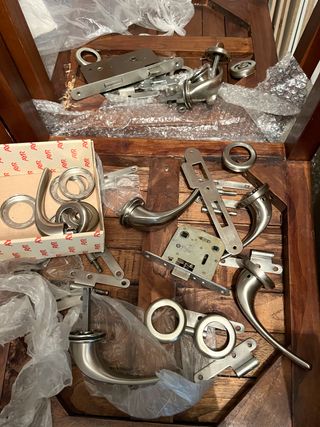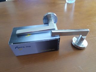 Juego de manivelas para puerta de diseño moderno y elegante. - Acabado en acero inoxidable cepillado. - Incluye dos manivelas y sus correspondientes rosetas. se vende a 5€ cada una