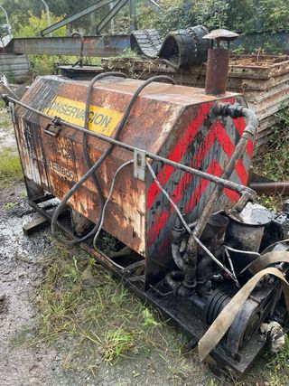 Cuba de emulsión o riego asfáltico, utilizada para trabajos de conservación de carreteras. Funciona perfectamente. - Fabricada en metal resistente. - Presenta signos de óxido y desgaste por el uso. - Incluye motor y sistema de bombeo.