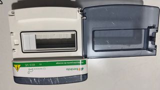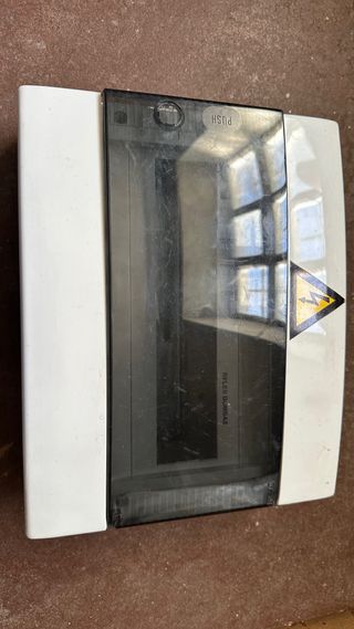 Cuadro eléctrico de superficie con tapa transparente abatible. En buen estado general, con signos normales de uso. Tiene 2 agujeros hechos en la carcasa (ver fotos). Ideal para garaje, trastero o instalación auxiliar.