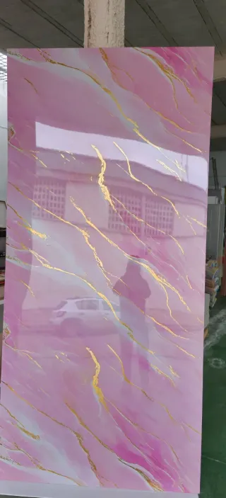 Placa decorativa con un diseño moderno y elegante, imitando el mármol en tonos rosas y blancos con detalles dorados. - Material: PVC. - Diseño: Mármol veteado en rosa y dorado.