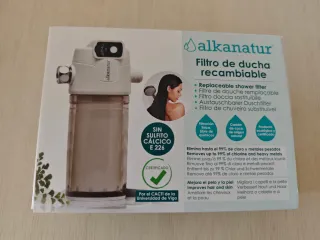 Filtro de ducha recambiable de la marca Alkanatur. Elimina hasta el 99% de cloro y metales pesados. - Mejora el pelo y la piel. - Filtración física, libre de químicos. - Carbón de coco de origen natural. - Producto ecológico y certificado. - Certificado por el CACTI de la Universidad de Vigo.