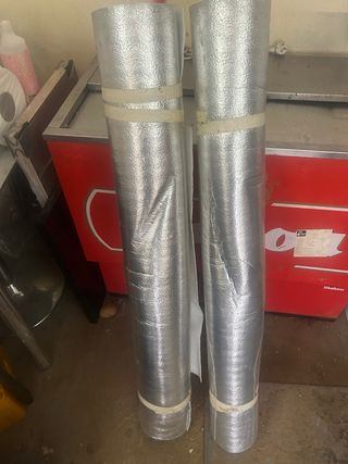 Se venden dos rollos de base aislante para suelo. - Material reflectante plateado. - Ideal para aislamiento térmico y acústico. - para poner por debajo de la tarima flotante.